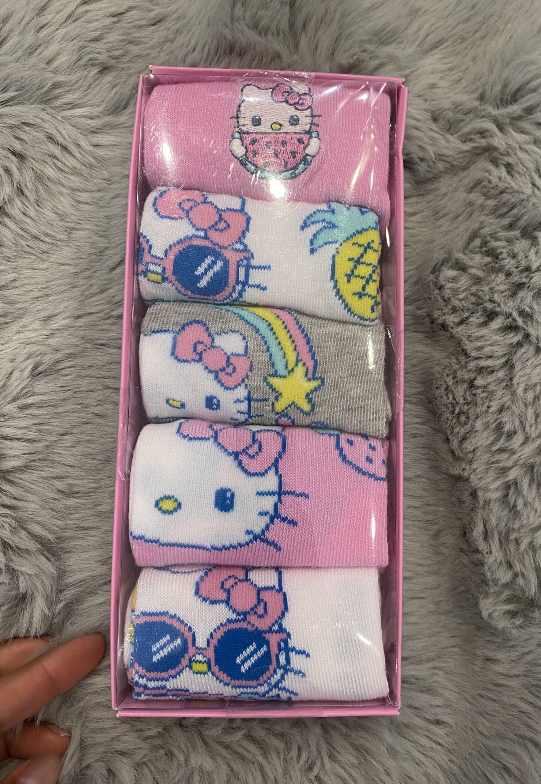 Com cinco pares coloridos, cada um adornado com o adorável personagem Hello Kitty, essas meias prometem conforto e estilo para o dia a dia.